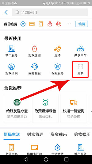 打開手機支付寶APP,注冊賬號,在軟件里找到更多服務。