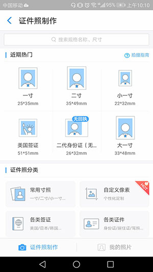 證件照制作里有很多功能,例如“一寸25*35mm”“二寸35*49mm”“小一寸22*32mm”“美國簽證51*51mm”“二代身份證26*32mm”“大一寸33*48mm”