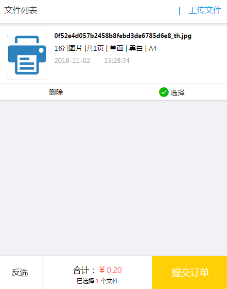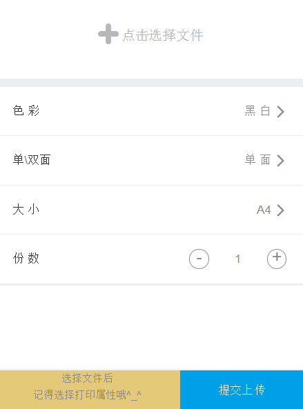+點(diǎn)擊選擇文件,把手機(jī)保存的照片或者文檔,上傳,然后按照需求設(shè)置色彩、單雙面、份數(shù)。最后提交上傳