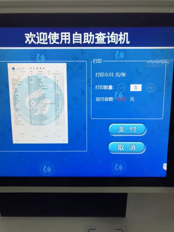 浩田新型自助打印設備。它通過自助服務終端向廣大學生提供“一站式”多種服務,可實現統一身份認證(校園卡和身份證識別功能)、成績單及中英文學籍證明自助打印、自助終端遠程管理、業務信息實時查詢、真偽信息在線驗證等功能,并且不受上班時間限制。