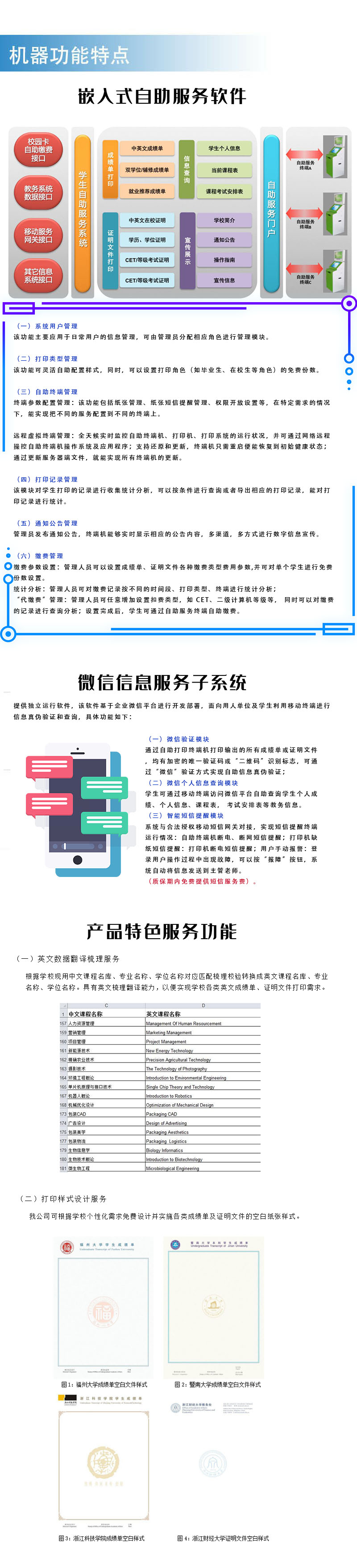 (1)建立一個(gè)高效實(shí)用的校園學(xué)生自助服務(wù)體系,在校內(nèi)設(shè)立若干臺校園自助打印系統(tǒng)設(shè)備,可以24小時(shí)不間斷地為學(xué)生提供便捷的成績單、證明文件打印。