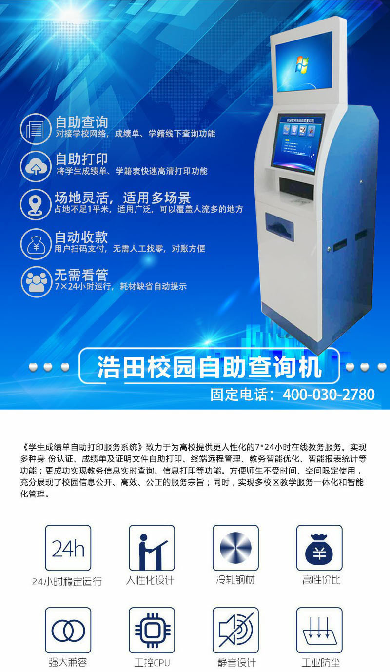 教務(wù)管理工作繁重。學(xué)院學(xué)生人數(shù)眾多,打印量大,若全都由老師來幫助學(xué)生打印,太耗時(shí)間。每年招生人數(shù)還在增加,這意味著教職人員的工作量在不斷增加。對于學(xué)院教務(wù)處來說,對學(xué)生的教學(xué)管理才是重點(diǎn),浩田自助查詢打印機(jī)老師把打印學(xué)生成績的工作時(shí)間節(jié)省下來,以最大程度減輕相關(guān)工作人員的工作量提高教務(wù)工作者的工作效率。